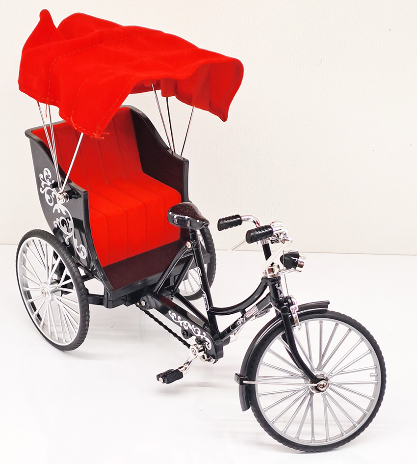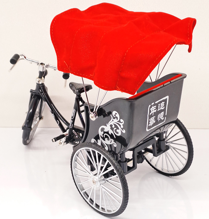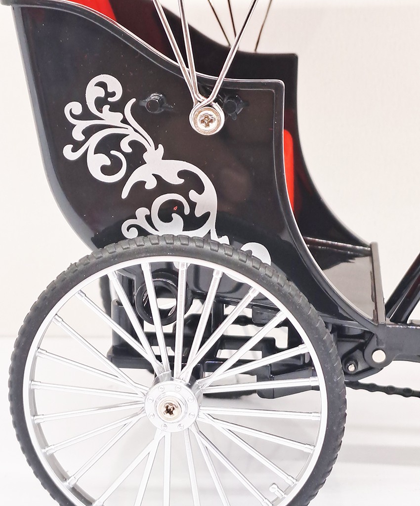یک ماکت زیبا و خاص از دوچرخه کالسکهای قدیمی، ساختهشده با جزئیات دقیق و طراحی ظریف.